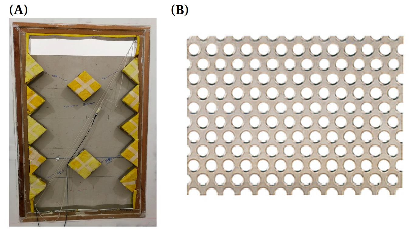 In order to prevent the fiber release, the fiberglass should be covered by a cover in reality, accordingly the sound absorption performance of the fiberglass might be affected. On the base of the configuration of Case 6, the paper employed the perforated metal sheet to cover the fiberglass as shown in Figure 6A. The perforated metal sheet composed of stainless steel SUS304 is of thickness 0.5 mm as displayed in Figure 6B; the diameter of the hole is 1 mm; the distance between two holes is 2 mm; the perforated rate is 22.6%. The TLs of the two cases are plotted in Figure 7. It can be seen that the TL is slightly decreased due to the presence of the metal sheet.