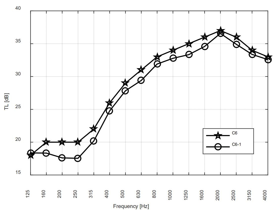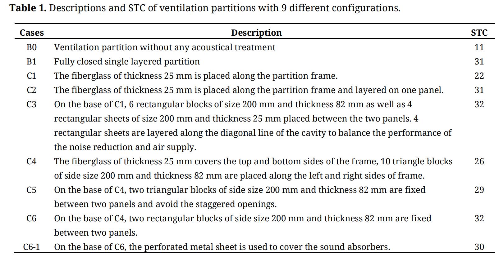 In addition, Sound Transmission Class (STC) [16] that rates the sound transmission loss into a single value is frequently used to characterize the noise reduction performance of partitions, and thereafter was employed alternatively for comparing the noise reduction performance of the partitions. The STC rating provides a single-parameter indicator for the speech noise reduction of partitation. The rating methodology is based on the measured spectra of transmission losses (TL) in the previous section compared to a standard reference contour provided by the ASTM E413-04 [16]. The STCs of all the cases are listed in Table 1. It can be seen that the STCs of Cases C3 and C6 are STC 32, which is 1 STC point higher than that of Case B1. The STC rating of ventilation partitions with acoustical treatment is at least 22 STC points and up to 21 STC points higher than that of ventilation partition without acoustical treatment in the present study.