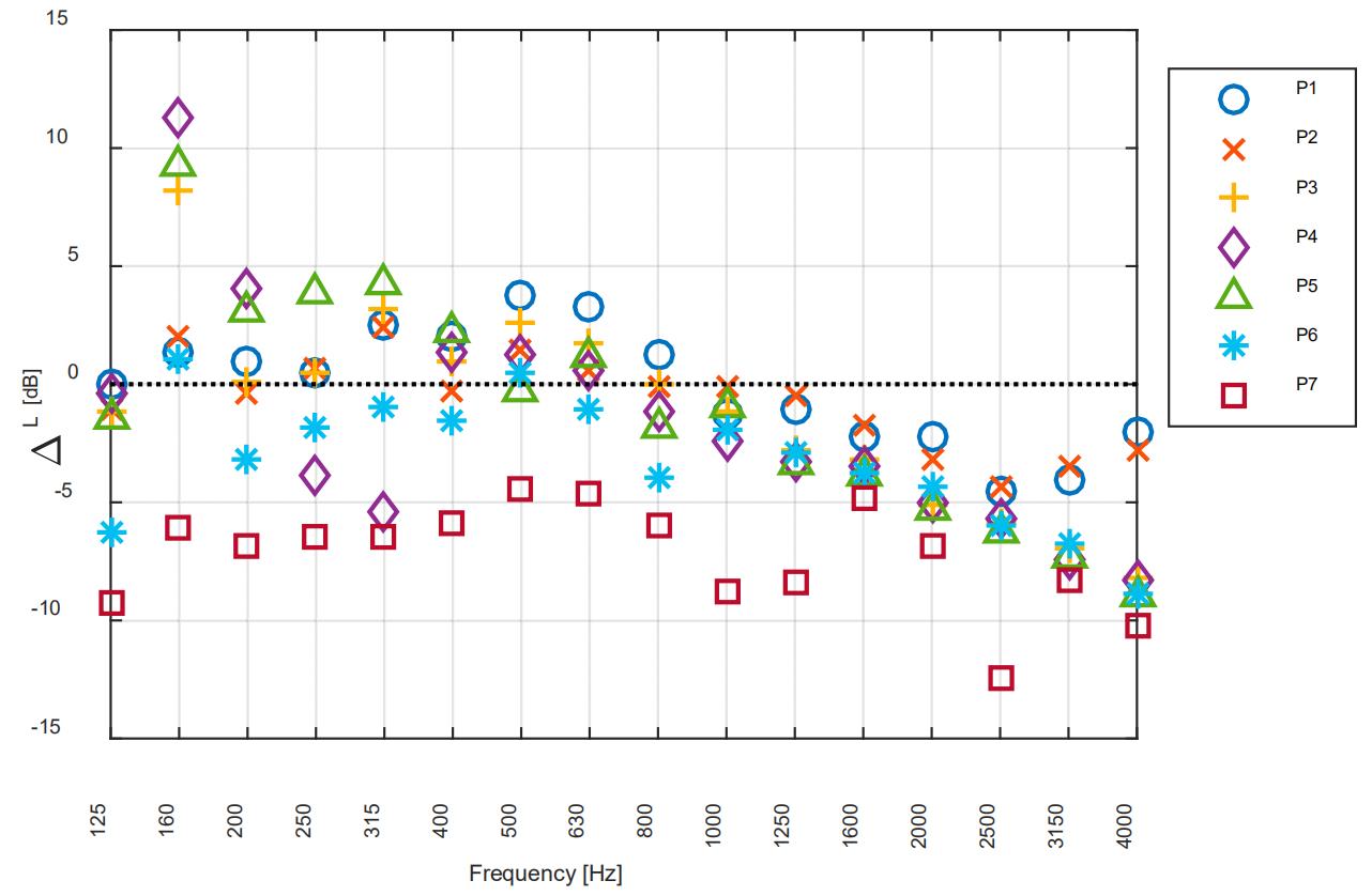 Figure 8 plots the difference ΔL between the SPLs and the averaged sound pressure level Ls in the source room with respect to Case B0. It can be seen that ΔL at the 7 points is larger or smaller than 0 dB at octave-band frequencies lower than 800 Hz. Besides, even the Point 1 is in front of the opening facing to the source room, the SPL at this point does not always present the largest. The reason is the following: since there is no acoustic treatment implemented for Case B0, the cavity is of hard surface boundaries, the modal behaviour of the cavity plays important roles on the noise radiation in these octave bands. In the contrast, at higher octave-band frequencies, ΔL of all the points is smaller than 0 while that of the points not facing to the openings is similar, which confirms that the sound energy in the cavity might be evenly distributed in the cavity because of the diffuse field in the cavity [18].