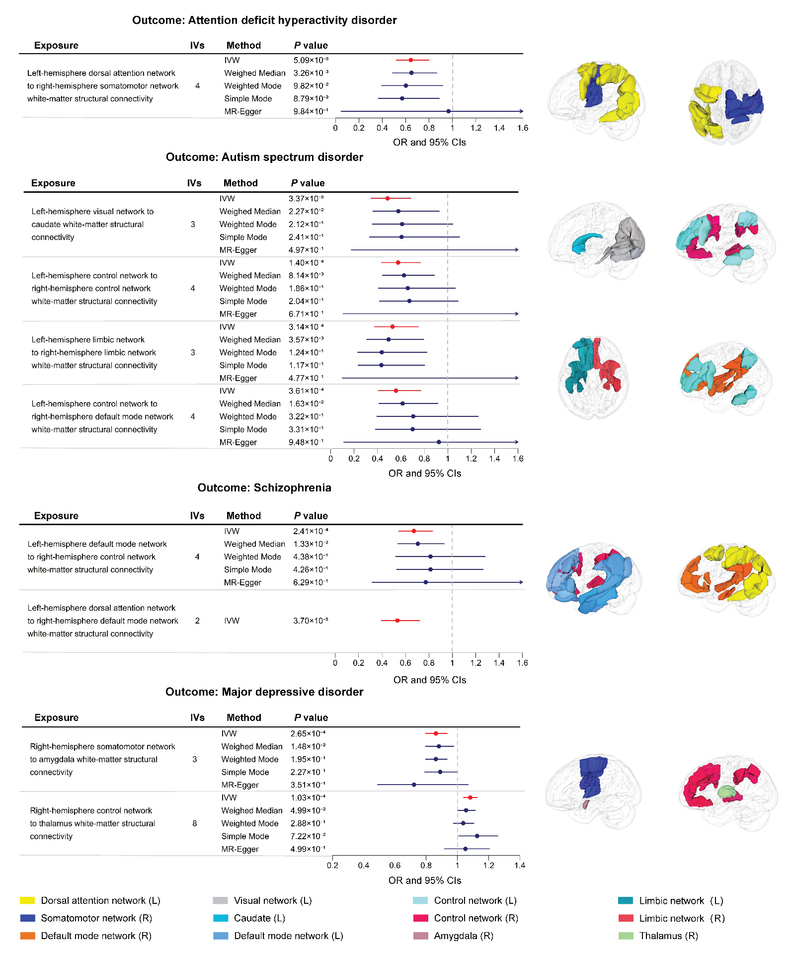 Figure 2. Causalities in the forward MR analysis. The forest plot shows the significant causalities estimated using five MR methods. The effect estimates represent the odds ratio (OR) for the risk of psychiatric disorder associated with a 1 standard deviation (s.d.) change in mean structural connectivity phenotype, and the error bars represent 95% confidence intervals (CIs). All statistical tests were two sided. A P value of < 4.46 × 10−4 after Bonferroni correction was considered significant. The pattern diagram on the right shows the brain anatomical regions of the corresponding structural connectivity phenotype.