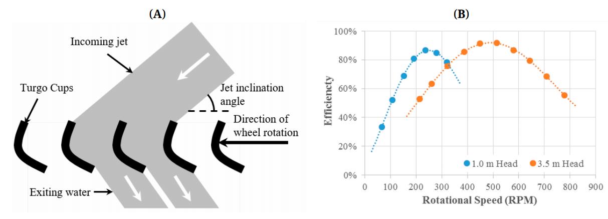 Figure 12. (A) Torque generation mechanism for Turgo turbine. (B) Low-head Turgo turbine tested at
