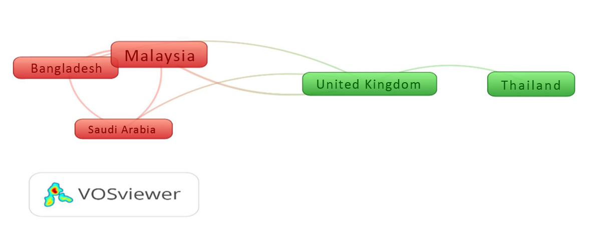The criteria employed as a standard for determining the magnitude and extent of the co-authorship network for each item is the total link strength (TLS) associated with each item. A higher total link strength (TLS) indicates a greater level of interconnection. It has been identified that among the five interconnected items (Bangladesh, Malaysia, Saudi Arabia, United Kingdom, and Thailand), Malaysia and Saudi Arabia exhibited the highest total link strength, namely 5, followed by Bangladesh with 4 TLS, Saudi Arabia with a total of 3 TLS, and ultimately Thailand with a total of 1 TLS.