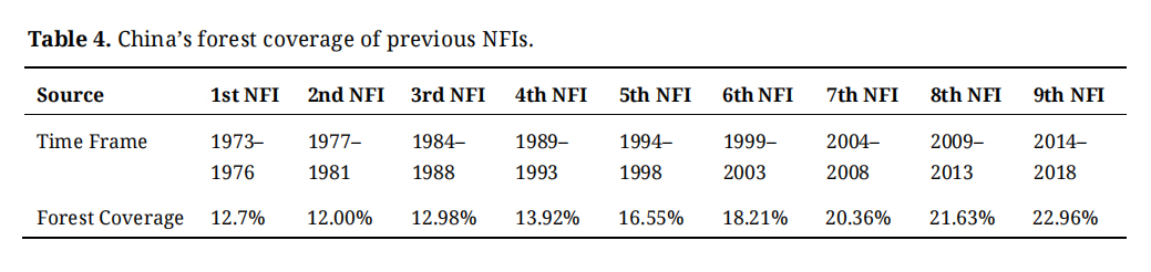 Under the guidance of China’s national forestry plans and driven by the targets in these FYPs, China’s forest coverage has been increasing according to the latest NFI, which has completed the goals and targets set before. Table 4 summaries the changes in detail.