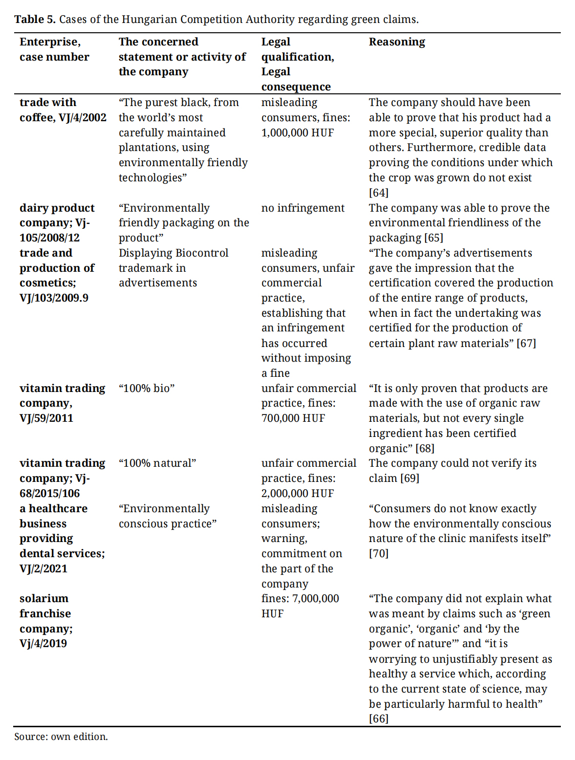 Legal CasesSince the Hungarian Competition Authority has competence in cases related to this (Table 5), we analyse the jurisprudence of this body. If the authority becomes aware of a possible infringement, or if it comes to light as a result of market analyses or market surveillance activities carried out by this state organ, it initiates proceedings. Several cases have emerged in the practice of the authority regarding green claims. In most cases misleading consumers is the committed infringement, and fines are imposed on the companies. However, in two occasions the corporations did not have to pay fines, warnings and own commitments were undertaken instead.
