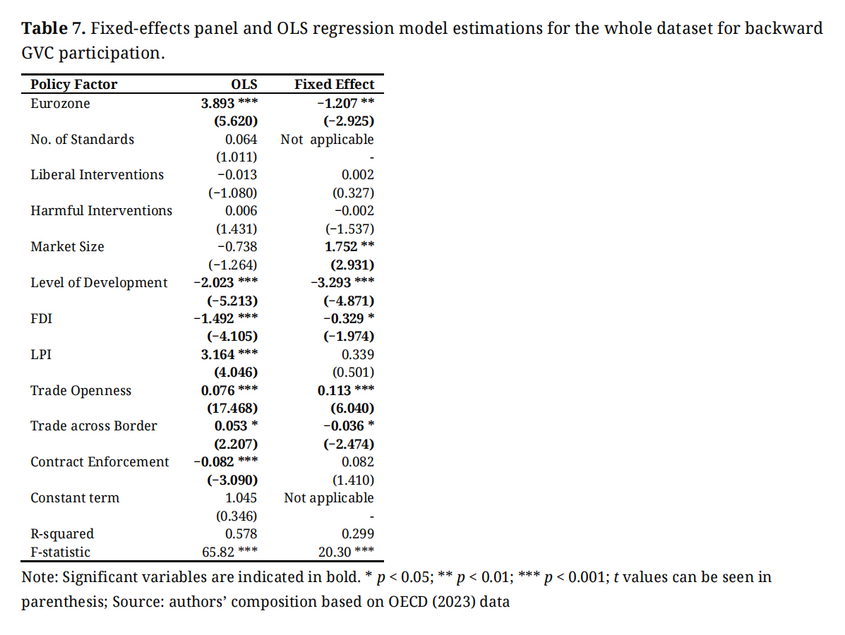 As is evident from Table 7, the main determinants of GVC participation were the Eurozone, market size, level of development, FDI, trade openness, and trade across the border regarding the fixed effect model. Eurozone, level of development, FDI, and trade across borders all have a negative and significant impact on backward GVC participation, suggesting that these market and policy-related factors may hinder countries from adding value to the whole value chain when importing from other countries. Only trade openness and market size had a significant and positive impact on backward GVC participation.