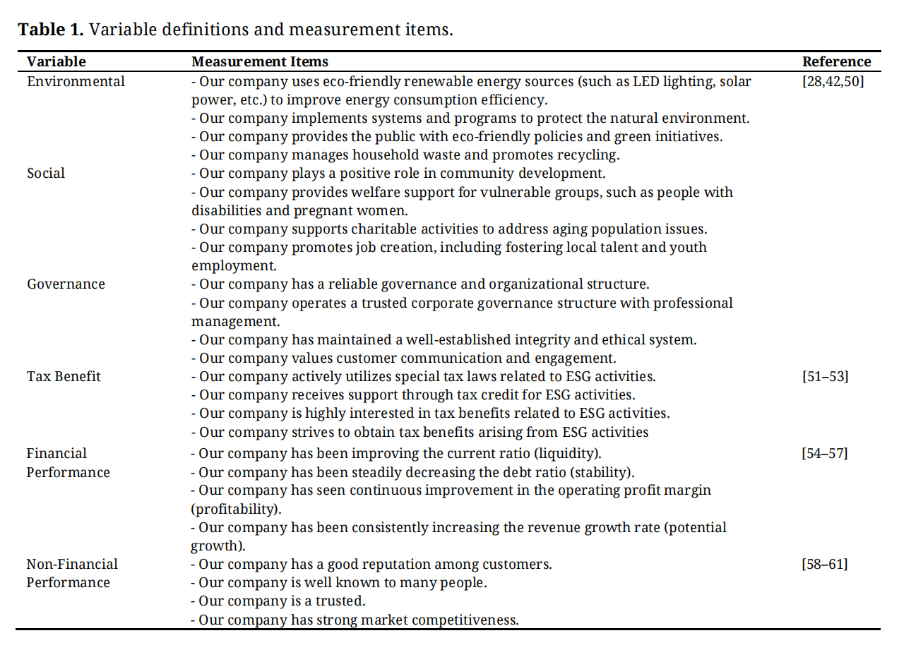 In this study, ‘environment’ means the various eco-friendly corporate activities with the aim of improving performance. ‘Society’ refers to corporate social responsibility activities for guaranteeing labor rights, promoting gender equality, providing a safe working environment, contributing to local communities, and protecting human rights. ‘Governance’ refers to establishing and maintaining a fair and transparent corporate governance system by emphasizing transparency and accountability in management decision-making processes. ‘Tax benefit’ refers to various preferential tax measures provided by the government to minimize the tax burden on certain taxpayers, whether individual or corporate. ‘Corporate performance’ refers to financial performance such as growth and profitability, and non-financial performance such as corporate reputation, trust, and market competitiveness.
