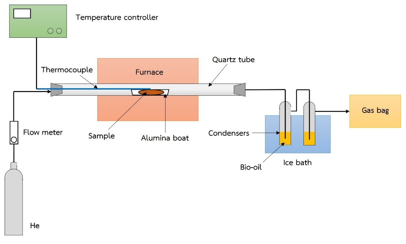 To complement the TGA results, a fixed-bed quartz tube reactor was employed to evaluate product distributions, especially the yield of bio-oil. In each experiment, approximately 60 g of biomass was loaded into a ceramic crucible positioned at the center of a horizontal cylindrical furnace, as illustrated in Figure 2. The reactor was purged with nitrogen at a flow rate of 200 mL/min for 20 mins to remove residual air, after which the sample was heated at a constant rate of 10 °C/min to 550 °C and held isothermally for 30 mins. A thermocouple located just above the crucible was used to monitor and control the reaction temperature. The condensable vapors were collected in ice-cooled condensers, while the bio-oil fraction was recovered for subsequent characterization. Non-condensable gases were collected in 10 L sampling bags and analyzed using a micro gas chromatograph (490 Micro GC, Agilent Technologies). After the reaction, the reactor was rapidly cooled under nitrogen flow, and the residual char was retrieved and weighed.