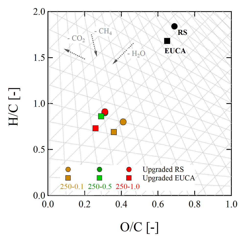 For EUCA, a similar but more pronounced trend was observed. The carbon content increased substantially from 48.3% to 69.1 wt.%, while the oxygen content decreased from 43.7 wt.% to 24.1 wt.% at a pressure of 1.0 MPa. The corresponding O/C and H/C atomic ratios decreased from 0.68 to 0.26 and from 1.68 to 0.73, respectively. These compositional changes—including the consistent reduction in O/C atomic ratio and the initial decrease in H/C ratio—suggest the formation of more condensed aromatic structures and thermally stable carbon. While the H/C ratio for EUCA showed a slight increase at higher pressures, the values remained significantly lower than in raw samples, supporting the overall trend toward enhanced aromaticity and thermal stability. Consequently, the HHV increased markedly from 20.28 MJ/kg to 26.51 MJ/kg—a 30.7% enhancement. Notably, significant improvement was already evident at 0.5 MPa (HHV: 29.2 MJ/kg), emphasizing the effectiveness of moderate-pressure oxidation.