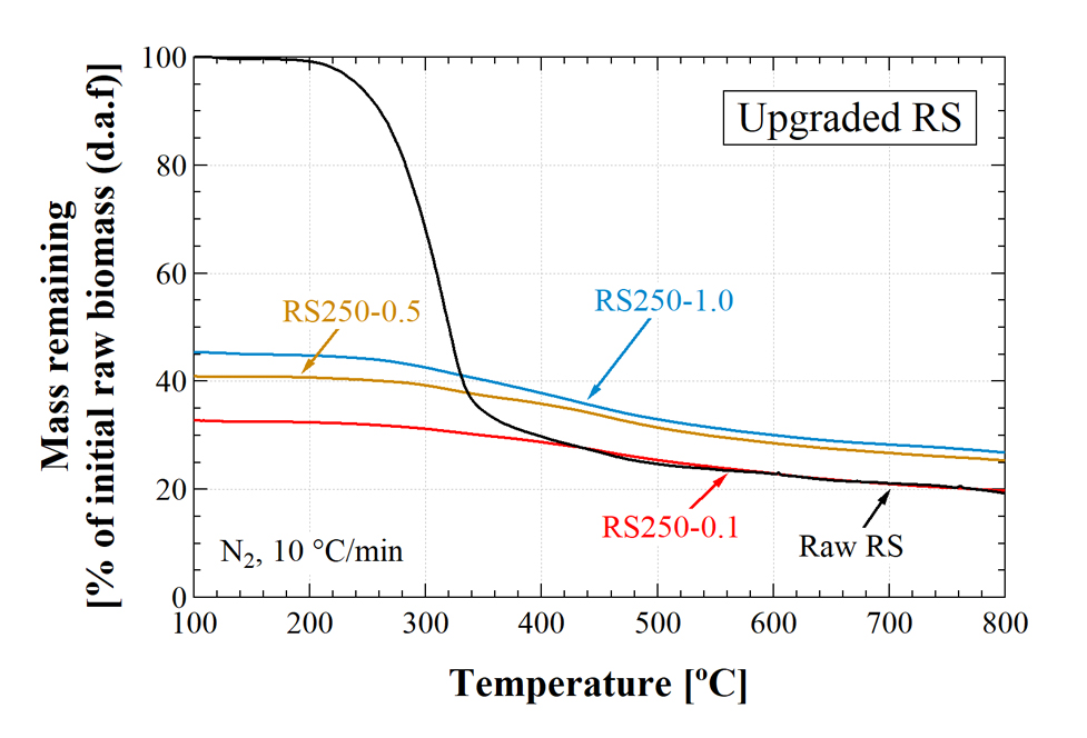 Pyrolysis Behaviors of Upgraded BiomassThe pyrolysis behavior of raw and upgraded biomass samples was investigated using thermogravimetric analysis (TGA) under a nitrogen atmosphere at a constant heating rate of 10 °C/min. All results are expressed on a dry and ash-free (d.a.f.) basis to eliminate the influence of ash. This approach ensures that the data reflect only the decomposition of organic matter, allowing for a consistent comparison of char formation among different samples. In addition, all TGA curves are normalized to the initial dry, ash-free mass of the raw biomass; for upgraded samples, the starting point equals the pretreatment solid yield (Table 1).