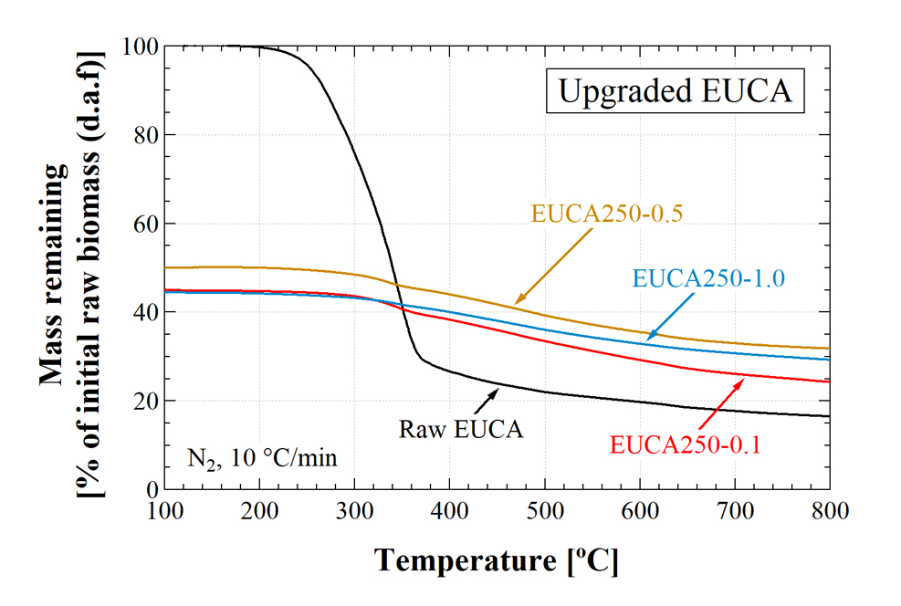 Figure 5 presents the TGA curves of raw and upgraded EUCA subjected to the same pyrolysis conditions. All upgraded EUCA samples exhibited higher char yields than raw EUCA. The maximum char yield (31.8 wt.%) was obtained from the sample pretreated at 0.5 MPa, followed by 29.3 wt.% at 1.0 MPa. The consistently higher char yields observed in EUCA compared to RS under identical pretreatment conditions can be primarily attributed to differences in structural composition, particularly lignin content. EUCA typically contains a higher lignin fraction (32.7 wt%) than rice straw (16.5 wt%), as shown in Table 1. Although lignin begins to decompose at relatively low temperatures (150–175 °C), its degradation proceeds more gradually over a much broader temperature window than cellulose and hemicellulose. Consequently, lignin-rich feedstocks retain more solid residues at elevated temperatures and produce more condensed, aromatic char, which is associated with higher thermal stability [34–36]. This helps explain the higher char yields observed for EUCA (higher lignin) relative to RS.