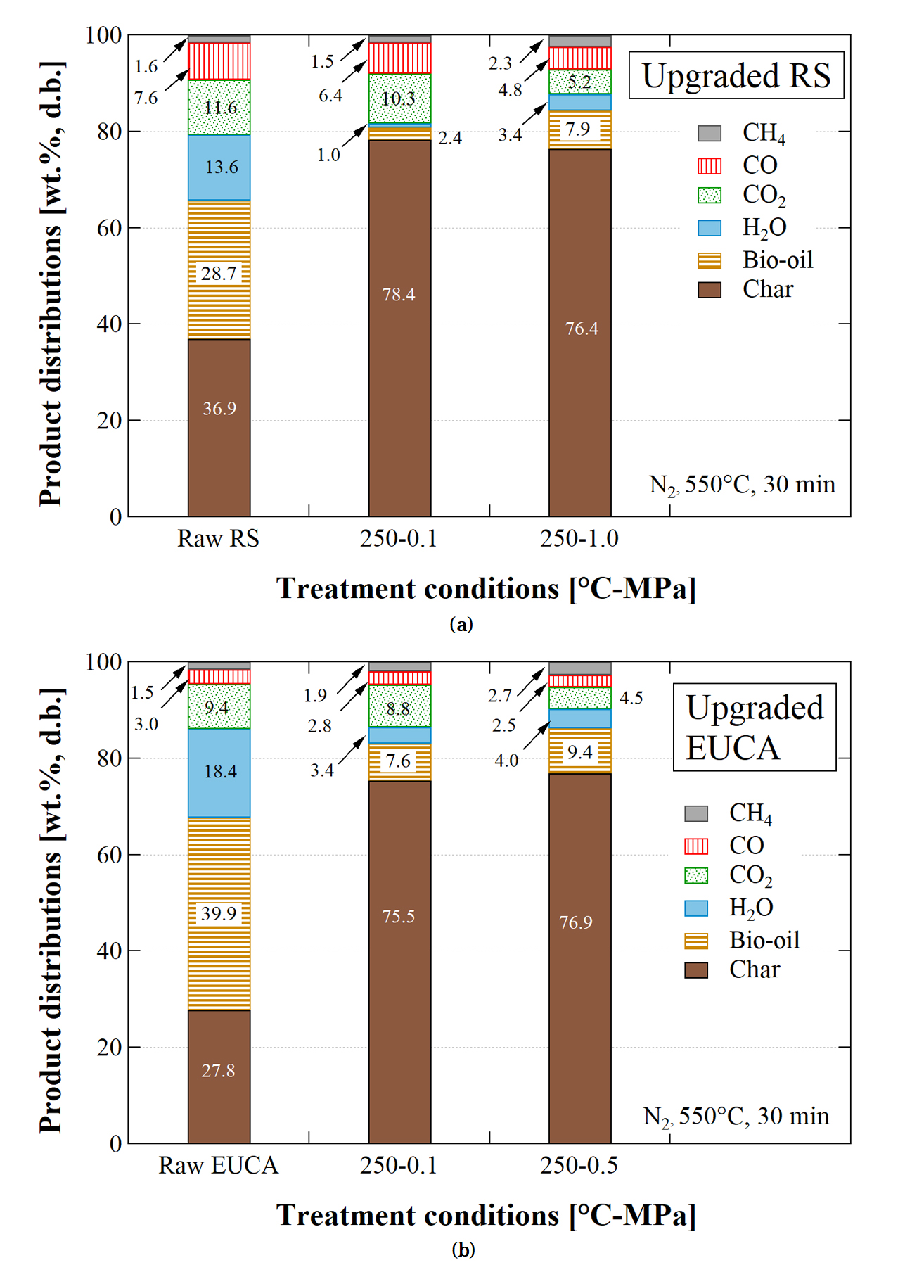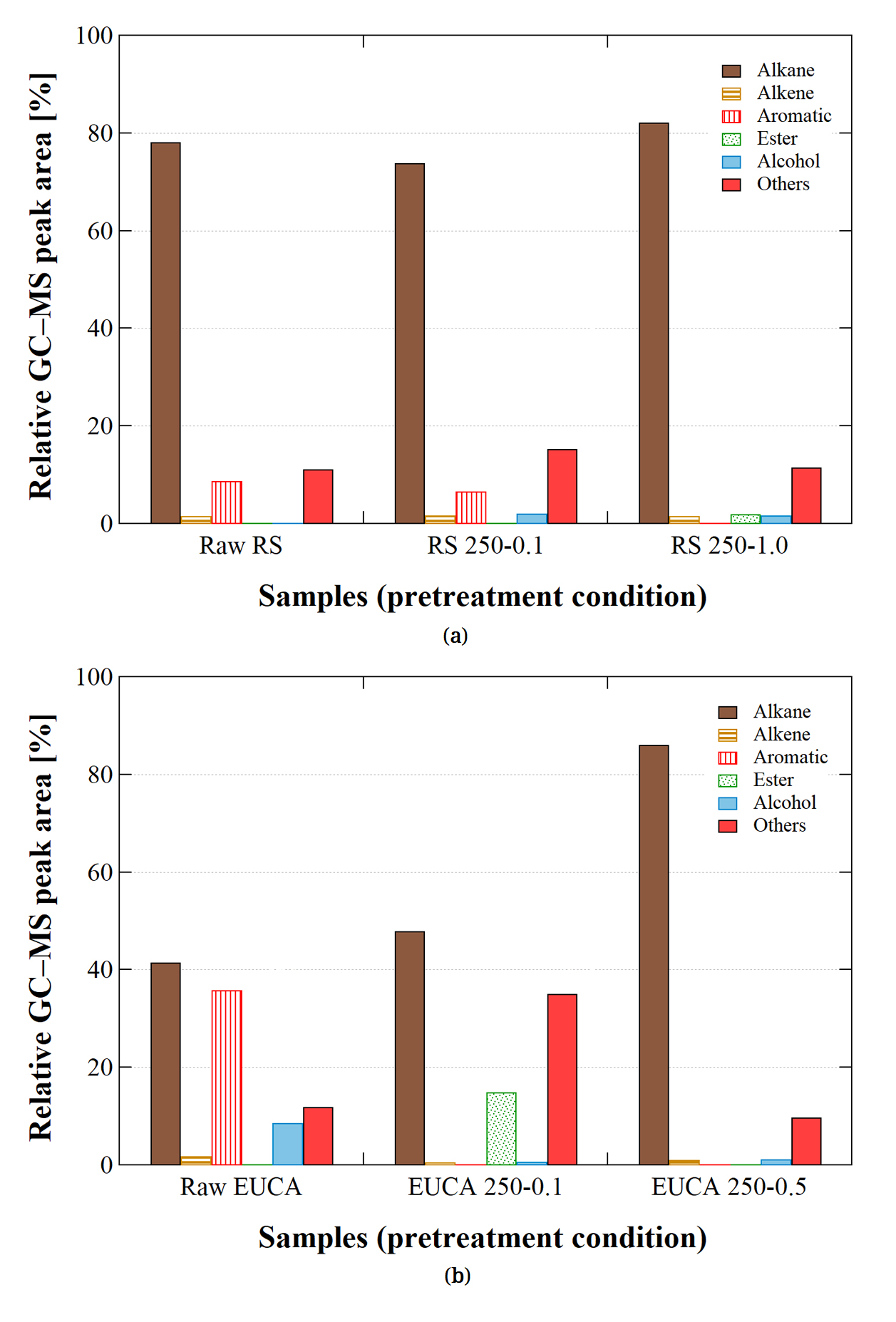 Product Distribution Obtained from Pyrolysis of Upgraded BiomassThis section investigates the production of bio-oil via pyrolysis using a fixed-bed system operated at 550 °C for 30 mins. Both raw and upgraded biomass samples, prepared under atmospheric and pressurized conditions, were compared. For RS, the RS250-1.0 sample was selected to represent the high-pressure condition, as it exhibited both the highest product yield and heating value. For EUCA, the EUCA250-0.5 condition was chosen due to its optimal balance of product yield (50.53 wt.%) and heating value, which is comparable to the 1.0 MPa condition. These selected conditions were used for comparison with the corresponding raw biomass samples in the subsequent analysis. It should be noted that the reported bio-oil yields were obtained from mass balances of the quantified products for both RS and EUCA. Light hydrocarbons (C2–C4) were not quantified in this study; however, their contribution under slow pyrolysis at 550 °C is generally minor and unlikely to affect the comparative trends presented.