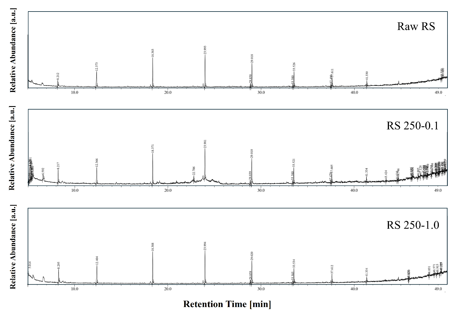 It is noteworthy that the condensable fraction comprised both organic bio-oil and reaction water, with water accounting for approximately one-third of the total condensable. A slight decreasing trend in the relative water content was observed with increasing pretreatment pressure: in RS, the proportion decreased from ~32.3 wt.% in the raw sample to ~30.1 wt.% in RS 250–1.0. Although the reduction is modest, it suggests a subtle but consistent trend toward lower water content in the condensable fraction under oxidative pretreatment. This observation may indicate a marginal improvement in the quality of the condensable liquids, as a reduced water fraction is generally considered more favorable for the subsequent utilization of bio-oil.