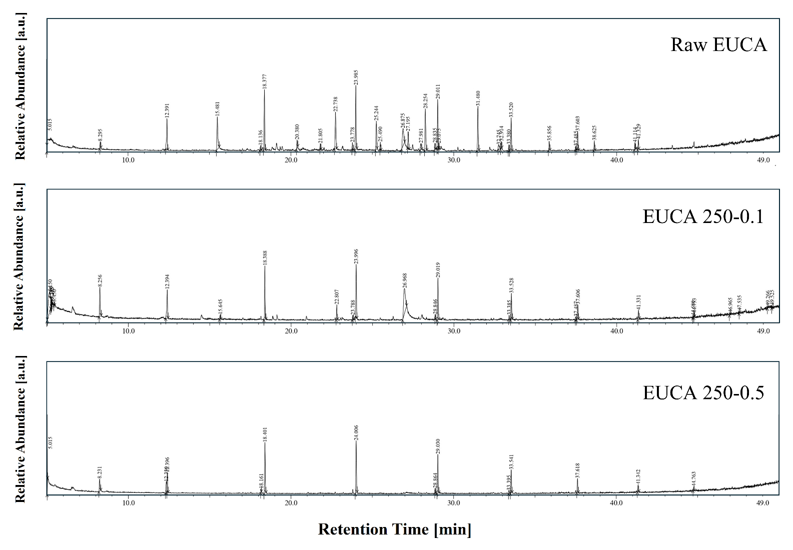 Chemical Compositions of Condensable Liquids Produced from Upgraded BiomassThe condensable liquids collected from RS, upgraded RS, EUCA, and upgraded EUCA were analyzed to evaluate the influence of oxidative pretreatment on chemical composition. As shown in Figures 7 and 8, the condensable liquids derived from the upgraded RS exhibited a slightly higher intensity of chromatographic peaks compared with raw RS, indicating subtle but discernible shifts in chemical composition. In contrast, the upgraded EUCA bio-oil showed a modest reduction in peak intensity relative to raw EUCA, suggesting that pretreatment promoted partial stabilization of intermediates, leading to fewer detectable compounds.