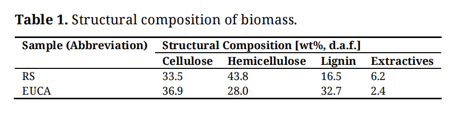 RS and EUCA were selected as the two biomass samples, derived from by-products of pulp mills and rice fields in Thailand. The raw biomass was first ground using a cutting mill and further reduced in size with a ball mill. The material was then sieved to obtain particles with an average diameter of approximately 1.5 mm, which were subsequently dried at 70 °C in a vacuum oven before the experiments. Table 1 presents the structural compositions of RS and EUCA, highlighting their significant differences.