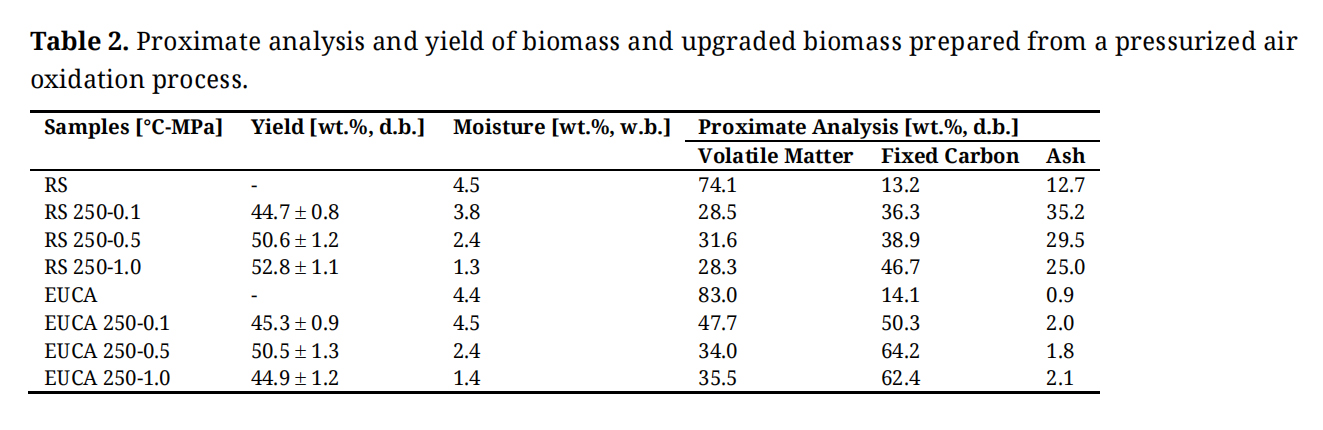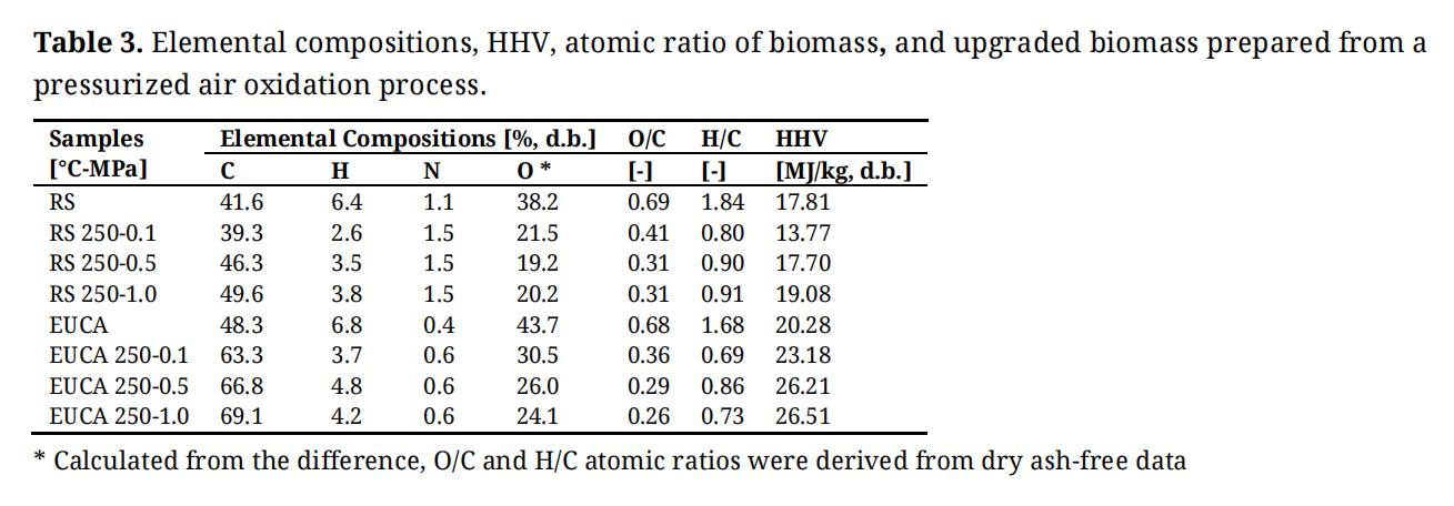 Table 3 presents the elemental compositions, HHV, and atomic ratios (O/C and H/C) of raw and upgraded biomass subjected to pressurized air oxidation. The results reveal clear evidence of chemical transformation, particularly in RS and EUCA, under varying oxidation pressures.