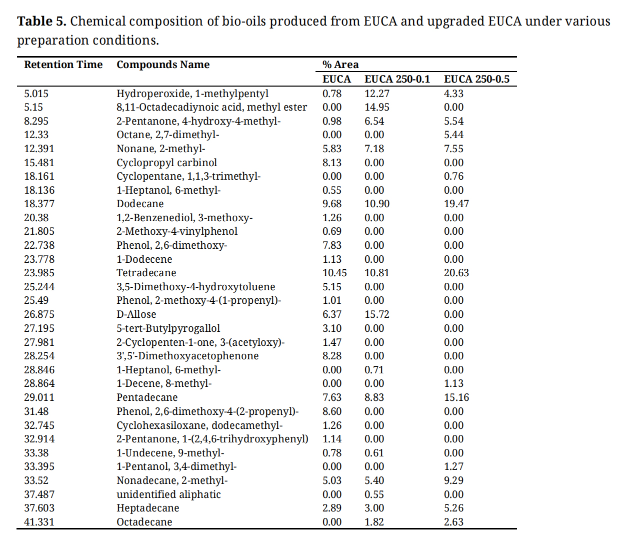 For EUCA (Table 5), lignin-derived methoxy-phenolics present in the raw oil (e.g., 2,6-dimethoxyphenol 7.83%, 2-methoxy-4-(1-propenyl)phenol 1.01%, 3,5-dimethoxy-4-hydroxytoluene 5.15%) disappear after pretreatment, while long-chain alkanes rise strongly: dodecane 9.68 → 10.90 → 19.47%, tetradecane 10.45 → 10.81 → 20.63%, pentadecane 7.63 → 8.83 → 15.16% (raw → 0.1 → 0.5 MPa). Transient oxygenates (e.g., hydroperoxide, 1-methylpentyl 12.27%; methyl 8,11-octadecadiynoate 14.95%) appear at 0.1 MPa but recede at 0.5 MPa. Together, EUCA shows a clearer shift toward long-chain aliphatics with suppression of phenolics/sugar-like species as pressure increases.