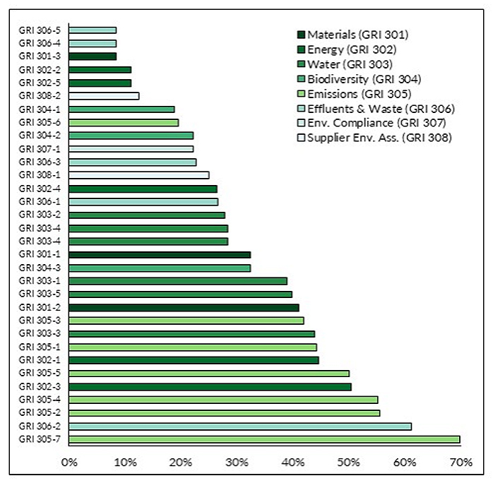 Energy (GRI 302) is another highly scored environmental theme, but displays selectivity: While energy intensity (302-3: 50.5%) and energy consumption within the organization (302-1: 44.2%) rank among the highest, energy consumption outside the organization (302-2: 11.1%) and reductions in energy requirements of products and services (302-5: 11.1%) score among the weakest across all environmental themes. A reason for this selectivity may be the complexity involved in monitoring energy consumption outside the organization (302-2) which requires tracking other firms, a more complex task than controlling internal energy consumption (302-1). In turn, reductions in energy requirements of products and services (302-5) demand a more detailed disclosure than general energy intensity indicators (302-1). These findings suggest a tendency to focus primarily on sub-GRI that can be easily measured.