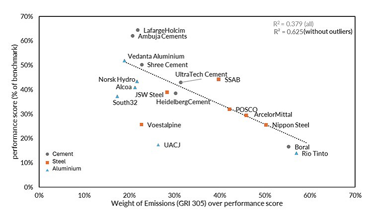 Emissions (GRI 305) represent a much higher proportion of the performance of low-scoring companies, whereas high-scoring firms diversify across multiple environmental indicators, reducing their score reliance on emissions. Figure 5 confirms this pattern, showing an inverse correlation (R2 = 0.379) between the weight of emissions (GRI 305) in total scores and company performance score, indicating that low-scoring companies focus primarily on emissions (GRI 305) at the expense of other environmental themes. The correlation strengthens significantly when considering weak performers UACJ and Voestalpine as outliers (R2 = 0.625).