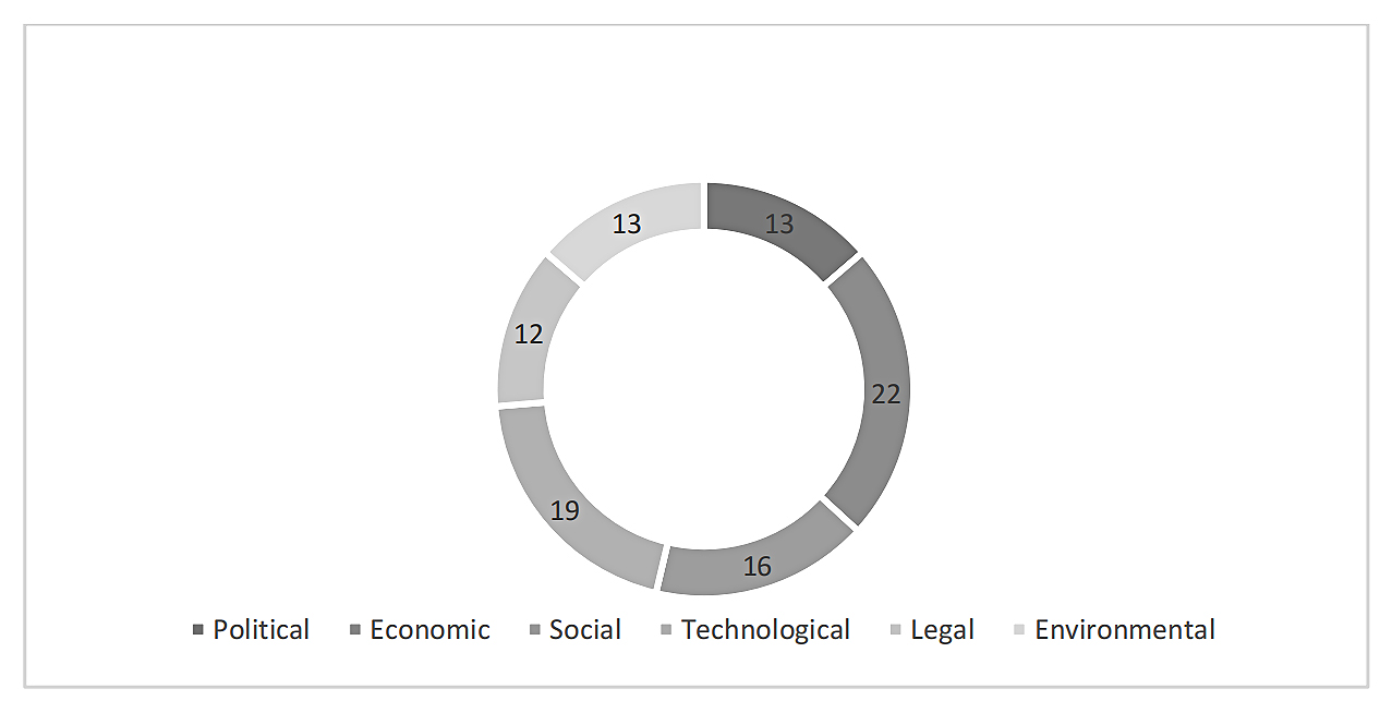 Figure 4 presents the distribution of references supporting the identification of barriers and drivers across PESTLE pillars. The economic dimension dominates (22 references), highlighting investment concerns, funding, and cost-benefit evaluations. Technological factors follow (19 references), reflecting infrastructure readiness and innovation. Social elements (16 references) focus on workforce skills, public perception, and stakeholder support. Legal and environmental pillars (13 each) reflect regulatory pressures and sustainability mandates, while political factors (12 references) relate to governance and public policy. Overall, this distribution underscores the multidimensional nature of port electrification and the value of PESTLE in structuring such analyses.