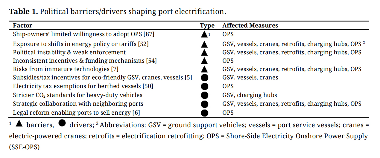 Political Drivers and BarriersPolitical factors both enable and constrain port electrification as highlighted in Table 1. A major barrier is shipowners’ reluctance to adopt Onshore Power Supply (OPS), often due to retrofitting costs and operational concerns. Ports also face uncertainty from fluctuating energy policies and tariffs, while political instability, inconsistent funding schemes, and unclear enforcement further deter investment. Risks tied to immature technologies, such as reliability and workforce retraining, add to stakeholder hesitation.