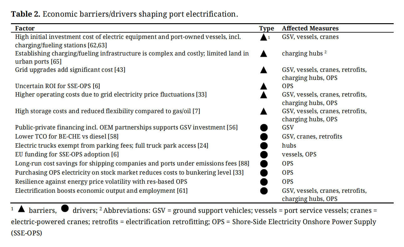 Economic Drivers and BarriersHigh upfront costs for electrified equipment, grid upgrades, and supporting infrastructure especially in space-constrained urban ports remain major economic barriers to port electrification (Table 2). These investments often come with uncertain returns, while reliance on grid electricity raises concerns over long-term operating costs and price volatility. Additional expenses include energy storage and limited flexibility compared to conventional fuels.