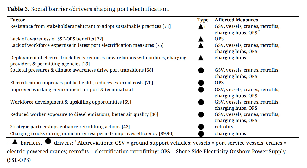 Social Drivers and BarriersSocial factors play a pivotal role in the adoption of port electrification, shaping stakeholder attitudes, workforce readiness, and public acceptance, as seen in Table 3. A key barrier is the reluctance of stakeholders to adopt new systems due to concerns about operational disruptions and unfamiliar procedures. This is often compounded by limited awareness of the environmental, health, and operational benefits of electrification. Skill shortages in managing electrified systems further hinder progress, especially in operating electric trucks, which also require coordination with new stakeholders such as utility and permitting agencies.