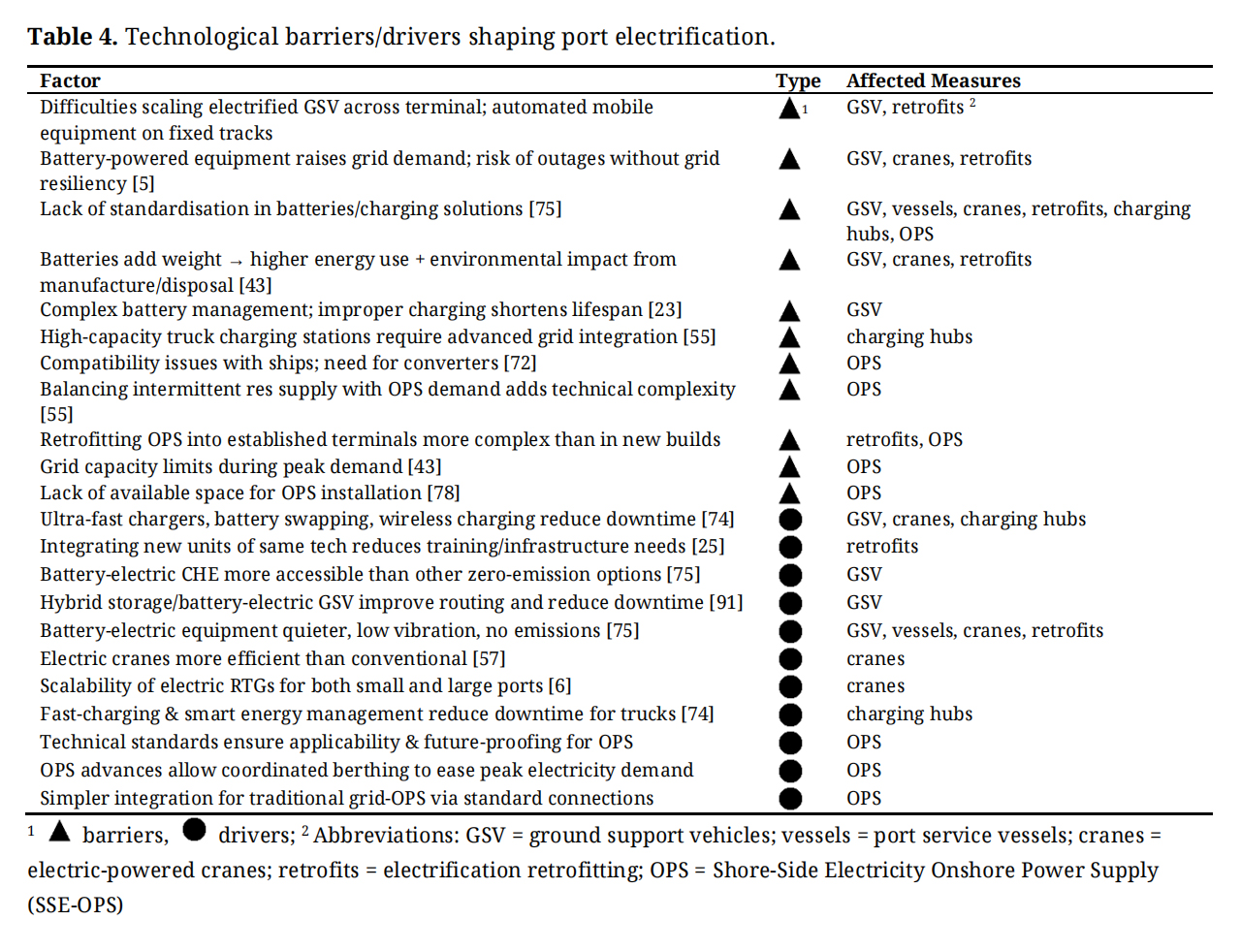 Technological Drivers and BarriersA key technological barrier to large-scale electrification in ports involves deploying GSVs and equipment operating on fixed tracks, highlighted in Table 4. Battery-powered machinery increases demand on local grids, risking power outages if grid capacity is insufficient. A lack of standardisation in battery sizes and charging systems among manufacturers leads to compatibility issues, complicating maintenance and procurement. Additionally, the increased weight of batteries raises energy consumption and challenges performance, while improper charging shortens battery life, requiring skilled personnel for optimal use. SSE-OPS systems demand advanced energy management, storage solutions, and hybrid designs to ensure stable supply. Compatibility challenges with ship systems and integration with renewable energy further complicate implementation. Retrofitting existing terminals is more complex than equipping new ones, especially in space-constrained ports.
