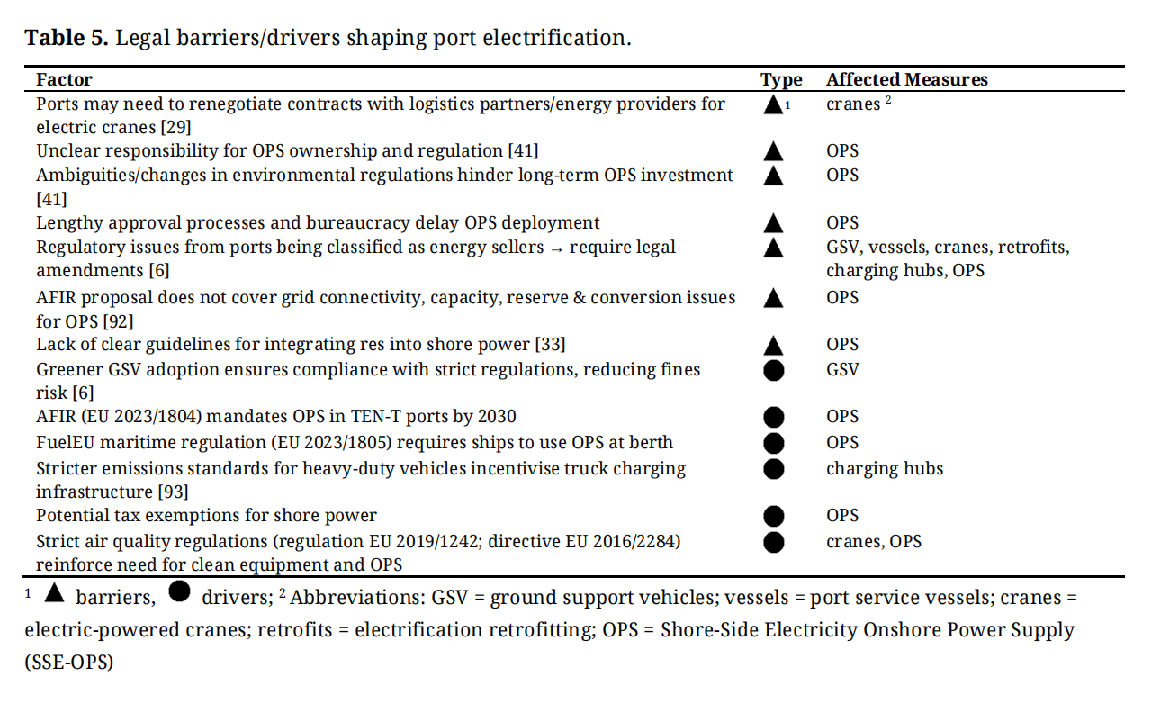Legal Drivers and BarriersSeveral legal barriers hinder port electrification, presented in Table 5. These include delays from renegotiating concession contracts, unclear responsibilities for OPS infrastructure, and complex approval procedures involving multiple authorities. Regulatory gaps around grid integration, renewable energy, and power standards further discourage investment. Nonetheless, legal frameworks like the AFIR and FuelEU Maritime Regulations mandate OPS deployment, while tax exemptions and stricter emissions rules incentivise compliance and support the long-term viability of electrification efforts.