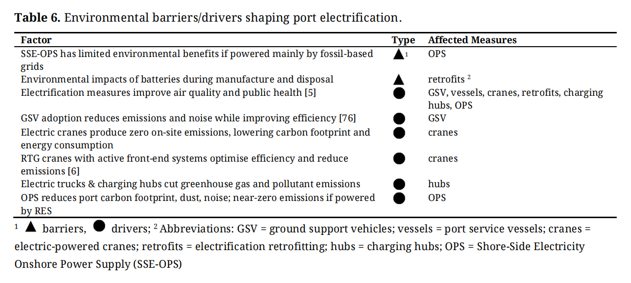 Environmental Drivers and BarriersA key environmental challenge in port electrification is the limited impact of SSE-OPS when supplied by fossil-fuel-based grids. Additionally, battery production and disposal raise sustainability concerns, including resource-intensive manufacturing and risks from hazardous waste. Despite these issues, electrification delivers substantial environmental benefits. GSVs, electric cranes, trucks, and SSE-OPS systems significantly reduce emissions of CO2, NOx, SOx, particulate matter, noise, and dust in and around ports. These improvements enhance public health and air quality. Electric cranes, especially rubber-tyred gantry cranes with active front-end systems, improve energy efficiency while eliminating on-site emissions. Similarly, electric trucks and charging hubs lower hinterland transport emissions. The environmental benefits are greatest when ports use electricity from renewable energy sources. Overall, these measures contribute to climate targets, improve sustainability, and support the transformation of ports into cleaner, low-emission logistics hubs as indicated in Table 6.