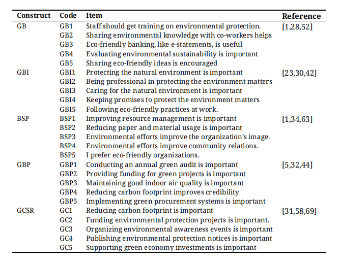 MeasuresAll measurement items for each construct were adapted from previously validated scales in the literature. The study examines employees’ perceptions of the relationships among GB, GBI, GBP, BSP, and GCSR. Each item was measured using a seven-point Likert scale ranging from 1 (“strongly disagree”) to 7 (“strongly agree”).