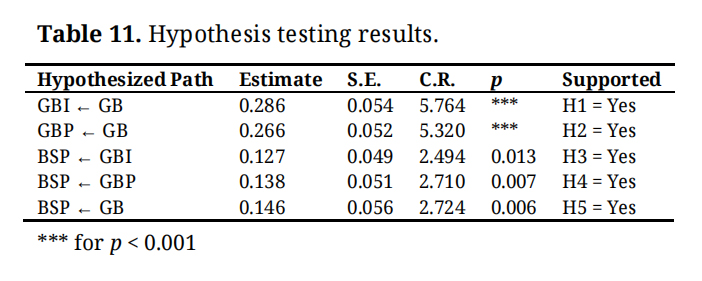 Table 8 presents the standardized regression weights and related statistics for various constructs involved in the study, such as GB, GBI, GCSR, GBP, and BSP. Each construct is measured through multiple items or indicators, with details provided on their factor loadings, standard errors, t-values, means, standard deviations, and internal consistency (Cronbach’s alpha). High factor loadings and t-values (generally above 1.96) indicate that the items reliably and significantly represent their respective constructs. For instance, the items related to GB show very high loadings and t-values, demonstrating they are strong indicators of that construct. The Cronbach’s alpha values are mostly above 0.9, reflecting excellent internal consistency and reliability of the measures. Overall, the table indicates that the measurement model is robust, with well-fitting items that reliably capture the underlying variables, ensuring confidence in the subsequent analysis of relationships among these constructs.