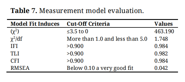 In Table 7, precision and the reliability of the proposed measurement model are shown in step 1 End of Table 7. These results are good evidence for both discriminant and divergent validity, as they indicate that the AVE (greater than 0.50), factor loadings/pattern matrix (above 0.70), Cronbach’s alpha, CR (greater than 0.70) but not the square root of the AVE, should be higher than the inter-construct correlations. The calculated regression coefficients and values of VIF vary between 1.748 and 1.946, indicating once again the absence of multicollinearity in the model. Fit indices are given in Table 7 (CMIN/DF = 1.748, IFI = 0.984, RMSEA = 0.042, TLI = 0.982, CFI = 0.984).
