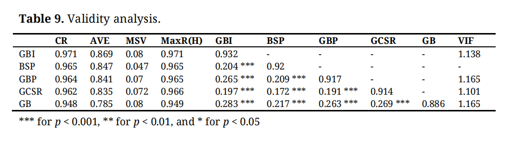 Table 9 presents a validity analysis that examines the relationships between various constructs in the study. The diagonal values, such as 0.971 for GBI and 0.847 for BSP, likely represent the square roots of the AVE, indicating the internal consistency of each construct. The off-diagonal values show the correlation coefficients between different constructs, with significance levels marked by asterisks: *** for p < 0.001, ** for p < 0.01, and * for p < 0.05. These correlations help assess discriminant validity, ensuring that each construct is distinct from the others. Generally, for good discriminant validity, the square root of the AVE (diagonal elements) should be higher than the correlations with other constructs, which appears to be the case here. Overall, the table confirms that the measures used are reliable and valid for further analysis in the study.