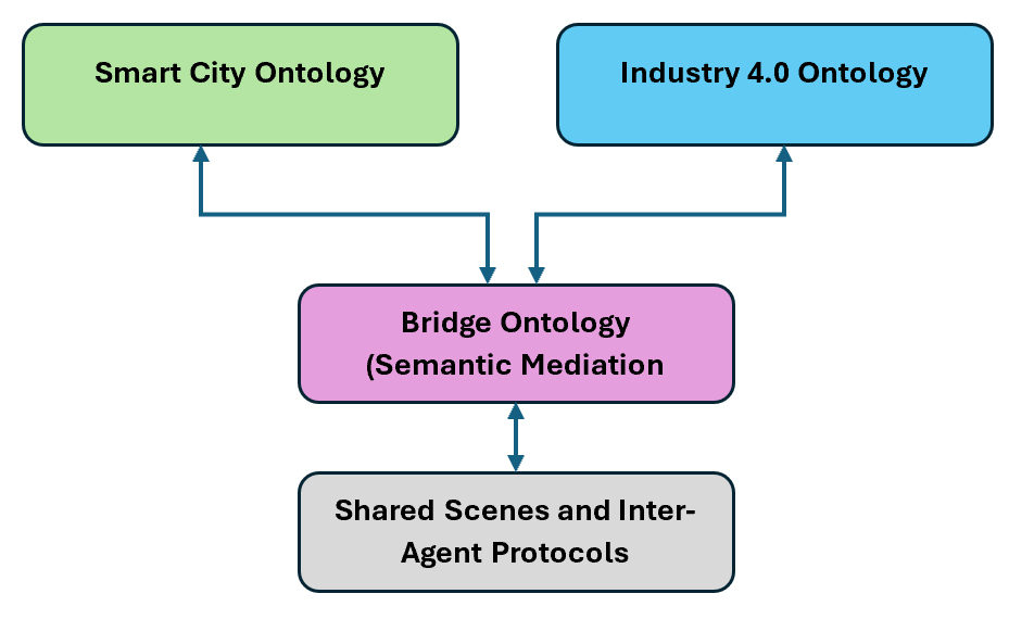 Agents operate and negotiate within their respective domains, optimizing local objectives such as mobility efficiency or energy balancing. However, they can also request or consume services from other domains through well-defined interfaces. The domains themselves remain unaware of each other’s internal logic or ontologies. This ensures functional interoperability without requiring full semantic or structural integration.
