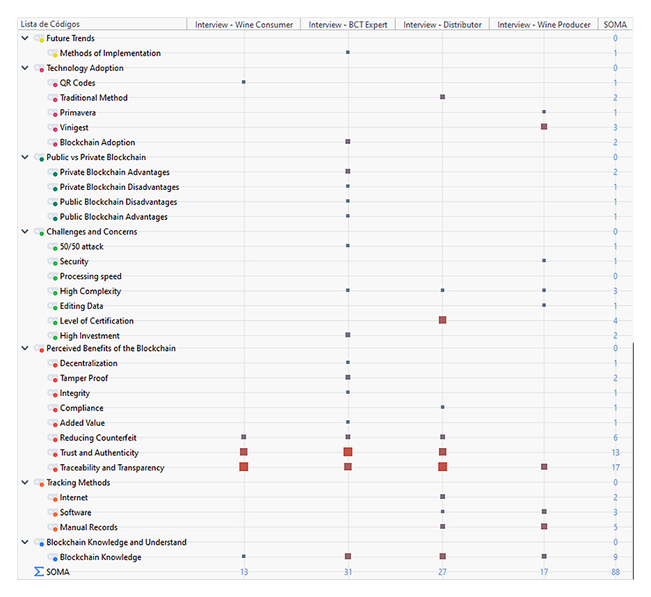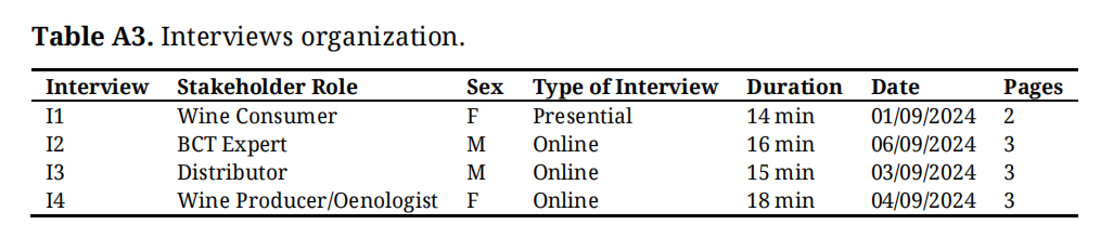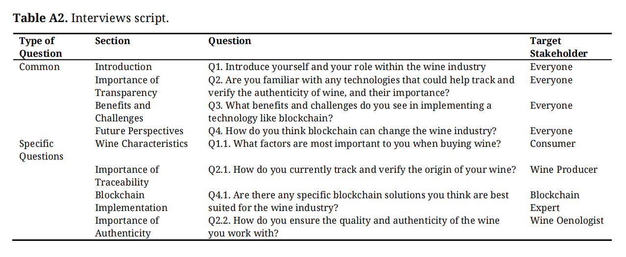 These interviews featured open-ended questions in Portuguese, tailored to the nationality of the participants, and were designed to be concise while capturing detailed insights from various stakeholders in the wine industry. The interview participants included a wine producer, a wine oenologist, a distributor, and a consumer [21]. Additionally, an interview with a blockchain expert was conducted to gain deeper insights into how emerging technologies can impact industry stakeholders. This approach provided valuable context for integrating technological advancements and enriching the overall analysis. Given this limitation, future data collection efforts will aim to engage a more diverse group of participants, including underrepresented stakeholders, to ensure a more balanced representation of the wine supply chain. Specifically, efforts will be made to recruit more producers, distributors, and certification bodies to provide a fuller picture of blockchain adoption across the industry. This approach will help address the current sample imbalance and allow for more comprehensive conclusions regarding blockchain’s impact across all sectors of the wine industry. The Table 2 summarizes the key dimensions and objectives of the interviews.