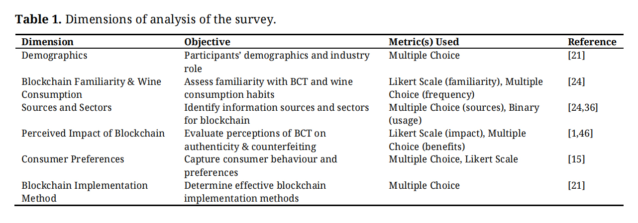Data CollectionThe first phase of the study involved a survey conducted via Google Forms, comprising 20 questions organized into several sections to explore various aspects of the topic. The survey began with an introductory section aimed at characterizing respondents, focusing on their relationship with wine and their familiarity with BCT. This was followed by a section assessing respondents’ familiarity with blockchain, exploring how and where they acquired their knowledge. The next section focused on stakeholder characterization and perceptions of blockchain’s potential benefits, with questions designed to be accessible even to those unfamiliar with the technology. The final section examined consumer behaviour related to wine purchases, specifically how buying decisions are influenced by the presence of a reliable authenticity and traceability system, and the preferred methods for implementing such technology. The Table 1 summarizes the dimensions of analysis within the survey, aligning them with the study objectives and the metrics used for evaluation.