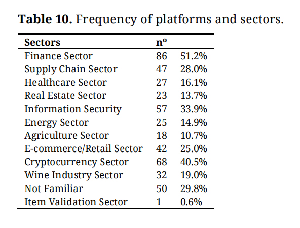The primary sectors where respondents identified blockchain usage include the financial sector (51.2%), cryptocurrency (40.5%), information security (33.9%), and the supply chain sector (47%). These selections align closely with the key sectors identified in the literature review [36] (Table 10).