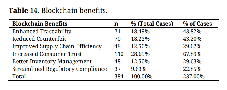 Regarding blockchain benefits, respondents identified increased consumer trust (67.9%), enhanced traceability (43.8%), and reduced counterfeit (43.2%) as the most significant advantages (Table 14).