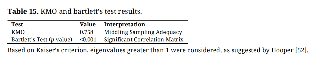 To determine the suitability of the data for factor analysis, the Kaiser-Meyer-Olkin (KMO) test and Bartlett’s sphericity test were performed. The KMO test measures the proportion of variance among variables that might be common variance, with values ranging from 0 to 1. A higher value indicates greater adequacy for factor analysis [50]. In this study, the KMO value was 0.758, indicating a “middling” level of sampling adequacy [51]. Bartlett’s sphericity test assesses whether the correlation matrix is suitable for factor analysis by evaluating the relationships between variables. A statistically significant result (p < 0.05) indicates sufficient correlations to proceed with the analysis [50]. In this study, the test yielded a value of p < 0.001, confirming the appropriateness of factor analysis (Table 15).