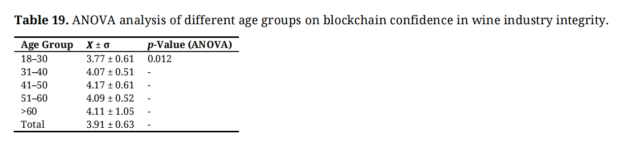 Explanation: This hypothesis directly connects to Research Question 4. It specifically investigates how age influences consumer confidence in blockchain, particularly regarding trust in its role in ensuring wine integrity.