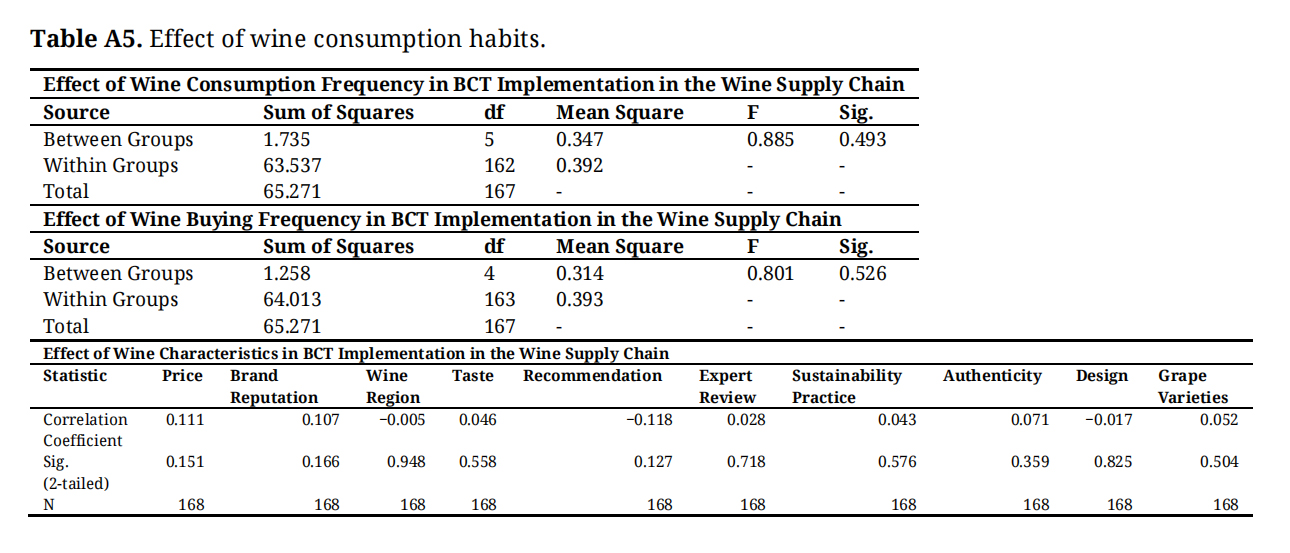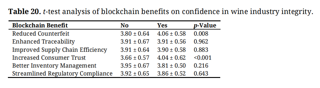 Wine consumption habits and product preferences did not significantly influence confidence in blockchain. This suggests that attitudes toward authenticity and traceability are not necessarily shaped by how frequently individuals consume or purchase wine, but by broader trust concerns and the perceived risk of counterfeiting.