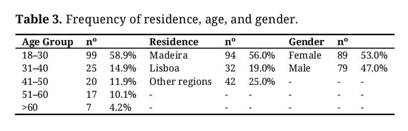 Of the valid responses, 89 (53%) were female and 79 (47%) were male. Most respondents (58.9%) were aged between 18 and 30, followed by those aged 31 to 40 (14.9%). The largest proportion of responses came from Madeira Island (56%), with Lisbon contributing 19%. The Table 3 provides a detailed breakdown.