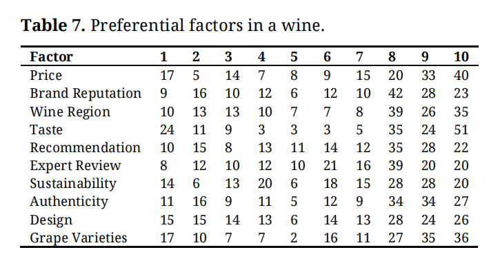 Most respondents tend to spend less than 20€ per bottle of wine (Table 6). Table 7 asked respondents to rank wine attributes from 1 (most important) to 10 (least important). While the results are dispersed due to the ranking format, certain patterns emerge. Taste consistently appeared among the top three choices (with 44 responses ranking it 1st, 2nd, or 3rd), making it the most prioritized factor overall. Price, grape variety, and wine region followed closely in frequency within the top five rankings.