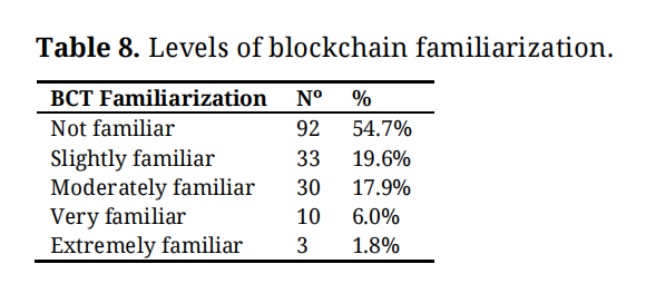 Blockchain Familiarity: In terms of blockchain familiarity, most respondents in this study ranged from being largely unfamiliar (54.8%) to moderately familiar (17.9%), with approximately 13 individuals demonstrating a deeper understanding of BCT (Table 8). This trend can be attributed to the fact that blockchain has only gained significant popularity in recent years [40].