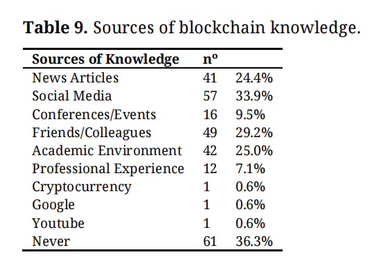 Among those familiar with blockchain, the majority reported learning about it through social media (33.9%), friends and colleagues (29.2%), the academic environment (25%), and news articles (24.4%) (Table 9).