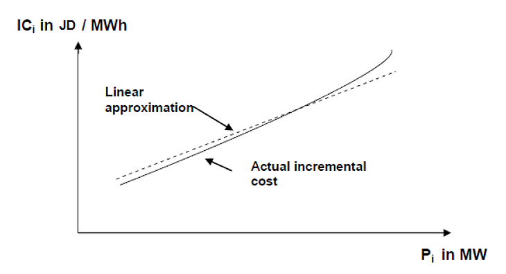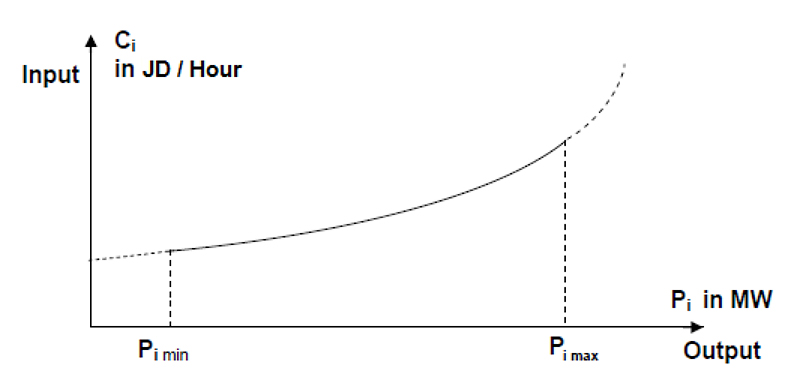 Unit CommitmentUnit commitment involves managing on/off generating units. Various methods have been developed to find effective solutions within a reasonable timeframe. These methods include priority lists, dynamic programming, Lagrangian relaxation, genetic algorithms, simulated annealing, and other computational techniques [1]. Economic Dispatch focuses on determining the power output of each power plant and each generating unit specifically to minimize the overall cost of meeting the system load. Power plants contain multiple generating units that require substantial financial investments. Operating costs are affected by several factors including general and administrative expenses, fuel costs, accumulated depreciation, interest, and maintenance costs. Among these factors, fuel cost is the most significant and controllable component. Therefore, for further analysis, we only considered the fuel cost. Each unit has an input-output curve that reflects the quantity of fuel used at different output power levels. This fuel quantity is measured in tons per hour, or millions of BTUs per hour. By determining the cost of fuel in terms of JD/ton or JD/million BTUs, the power generation cost can be expressed in JD/h. If Ci (in JD/h) is considered the input cost to generate a power output of Pi MW in unit (i), Figure 2 illustrates a typical input-output curve of a generating unit [17]. Each generating unit has a minimum power output of Pi min and a maximum power output of Pi max, which must be maintained.