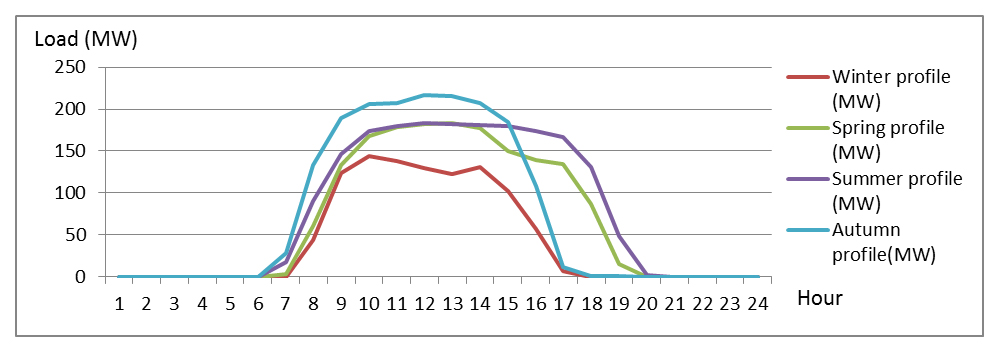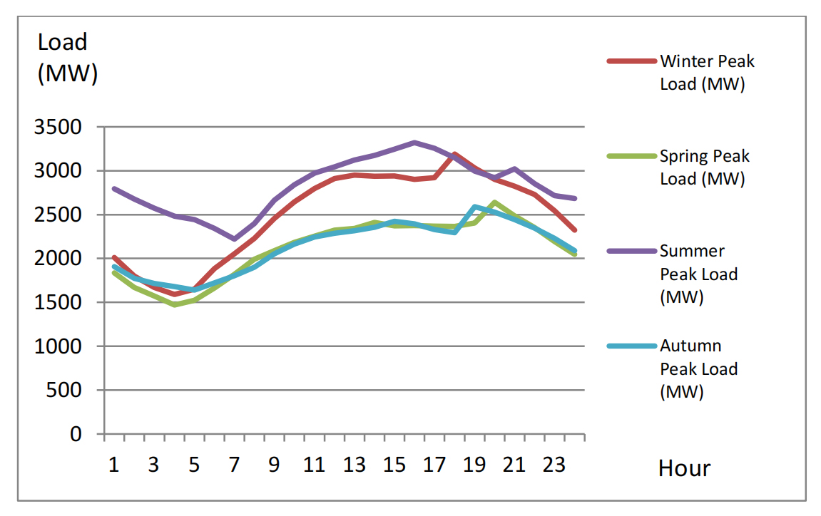 The decision on which units to run is highly dependent on the daily load profile. While three seasons (winter, spring, and autumn) saw the load peak after sunset (Figure 4), the summer peak occurred at midday, followed by a slower decline. This marked seasonal difference in load patterns complicates the operator’s task, primarily because of the financial and technical burden of cycling units, including startup, shutdown, and fuel marginal costs.
