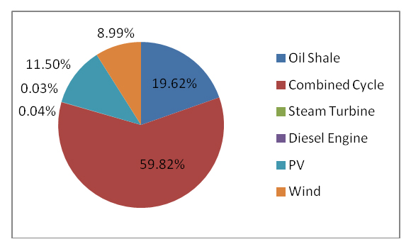 Generating unit modeling in Jordan can be classified into two categories: conventional power plants, which consist of the following types: Combined Cycle (CC) units, which consist of two GTs and one ST; GT units, commonly known as simple cycle units; ST units; DE units, known as reciprocating engines, operating at full or zero load; and Oil Shale power plants, which will be in service during the year 2025. The CC units consisted of GTs with exhaust connected to a ST to utilize the higher temperature of the outlet air for electricity generation. These units were simulated in the model under different operational and transitional modes, such as one GT plus its ST (half CC). This simplifies the operation process of the Jordanian system, reduces constraints and transitions between states, and reduces the computational time for the software. The DE units were modeled as one unit with a specific rated capacity. Conventional generation units in the JPS can be found in [1].