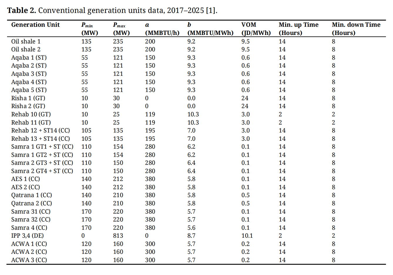 In Table 2, the data for conventional generation units, including the major constraints, are used for the simulation program (PLEXOS) and consist of Pmin, Pmax, a and b (constant coefficients of the generating units), VOM, Minimum up time, and minimum down time.