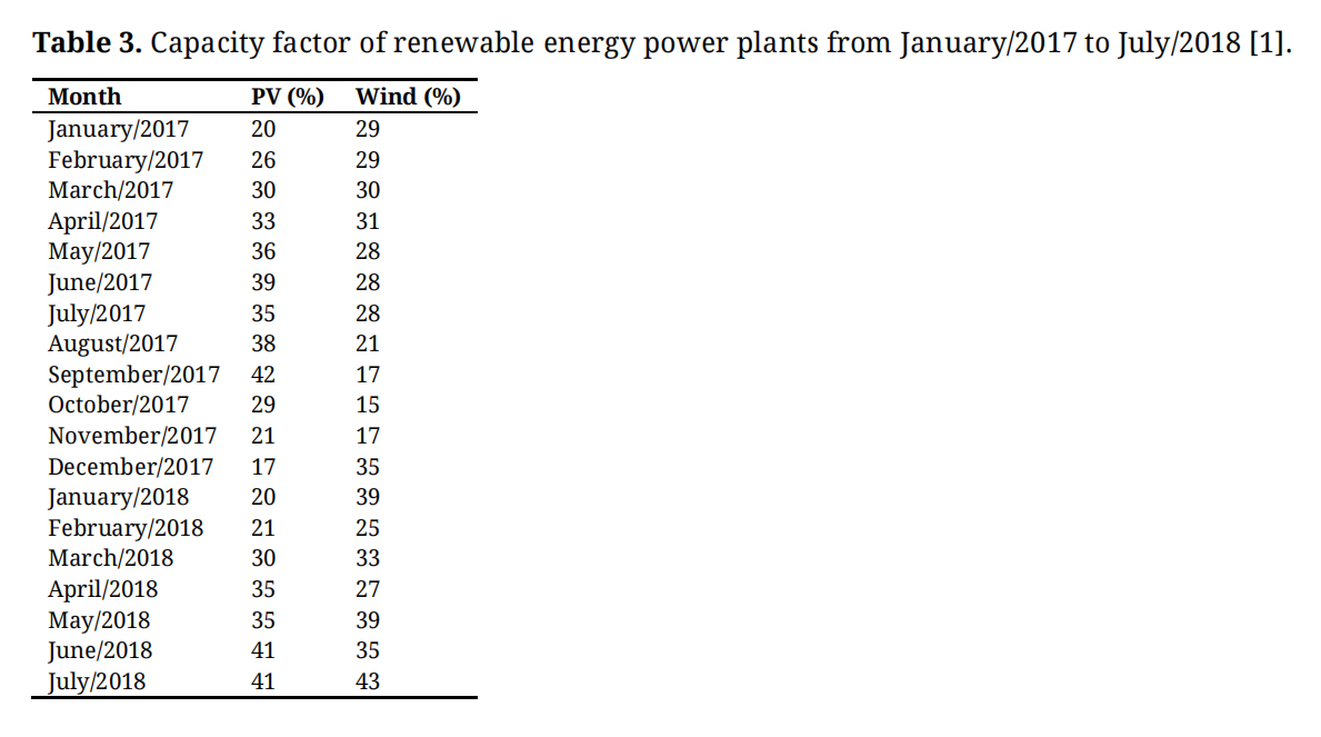 Table 3. Capacity factor of renewable energy power plants from January/2017 to July/2018 [1].